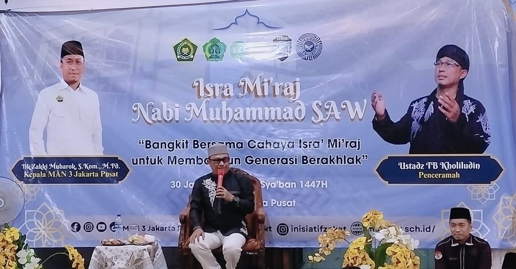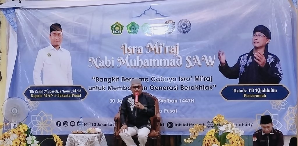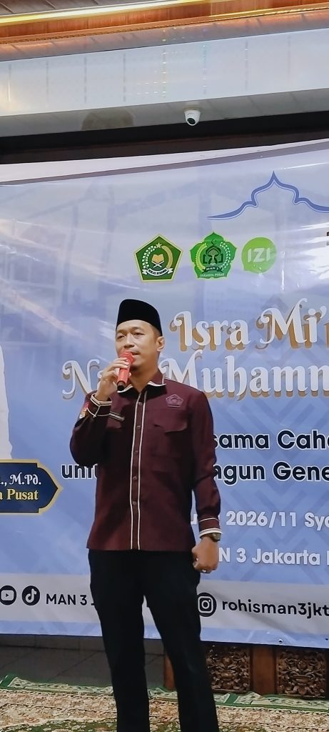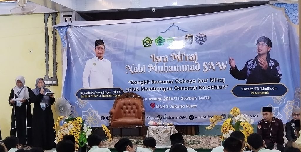 Jakarta, 30-01-2026 (HUMAS MAN 3 Jakarta Pusat) — Madrasah Aliyah Negeri (MAN) 3 Jakarta Pusat menyelenggarakan Peringatan Hari Besar Islam (PHBI) Isra Mi’raj Nabi Muhammad SAW Tahun 2025 dengan tema “Bangkit Bersama Cahaya Isra Mi’raj untuk Membangun Generasi Berakhlak”. Kegiatan ini dilaksanakan di Masjid Al-Ikhwan MAN 3 Jakarta Pusat pada Jum’at, 30 Januari 2025, mulai pukul 07.00 WIB hingga selesai, dan diikuti oleh seluruh Guru dan Tenaga Kependidikan (GTK) serta peserta didik MAN 3 Jakarta Pusat.