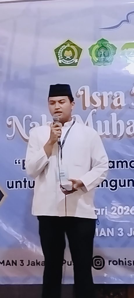 Rangkaian acara diawali dengan pembacaan ayat suci Al-Qur’an yang dibacakan oleh Alzena Shaista Putri Nima dari kelas X.5, yang menambah suasana religius dan menenangkan. Selanjutnya, acara dilanjutkan dengan laporan kegiatan oleh ketua pelaksana, Muhamad Hafids Ihsan (kelas 11.2) yang menyampaikan tujuan dan harapan pelaksanaan kegiatan agar mampu memberikan manfaat spiritual bagi seluruh peserta. Selanjutnya, Kepala MAN 3 Jakarta Pusat, Bapak Iik Zakki Mubarok, S.Kom., M.Pd., memberikan sambutan dan mengajak seluruh GTK serta peserta didik untuk mengikuti kegiatan Isra Mi’raj dengan sebaik-baiknya.