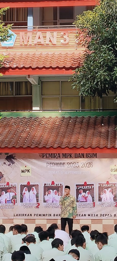 Jakarta, 12-09-2025 (HUMAS MAN 3 Jakarta Pusat) — MAN 3 Jakarta Pusat menyelenggarakan Pemilihan Raya (Pemira) 2025 pada hari Jum’at (12 September 2025) sebagai ajang demokrasi untuk memilih calon ketua dan wakil ketua Majelis Permusyawaratan Kelas (MPK) dan Organisasi Siswa Intra Madrasah (OSIM) periode 2025.