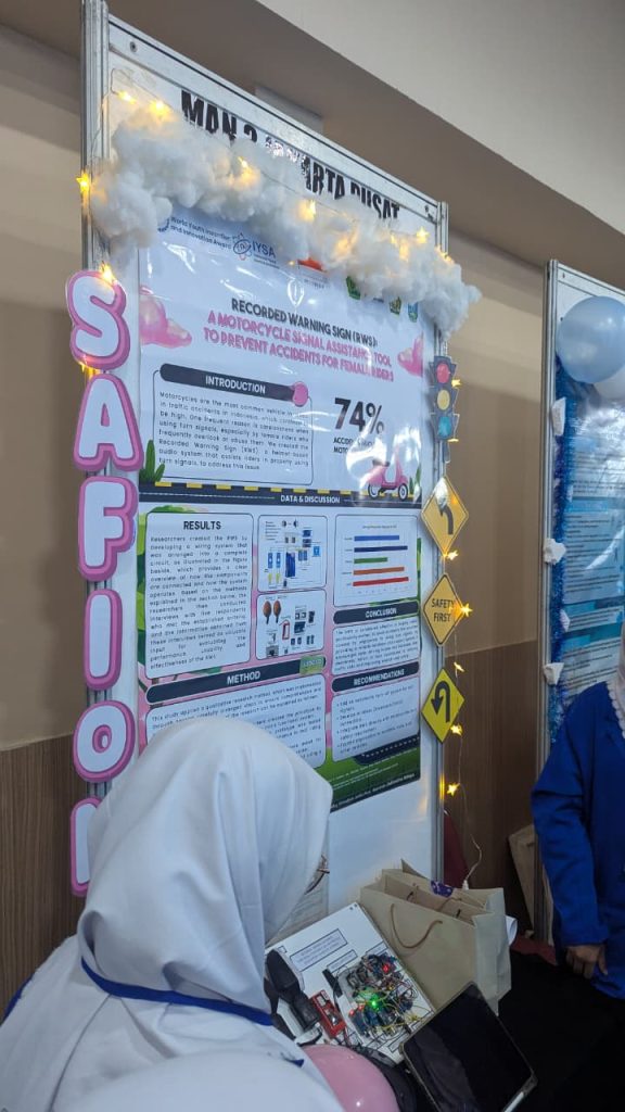 Tim MAN 3 Jakarta Pusat menampilkan inovasi berjudul RWS (Recorded Warning Sign), sebuah alat yang dirancang untuk membantu pengendara, khususnya wanita, agar tidak lupa menyalakan lampu sein saat berkendara dengan sepeda motor. Inovasi ini dianggap memiliki nilai guna tinggi dan relevan dengan keselamatan lalu lintas modern.